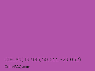 CIELab 49.935,50.611,-29.052 Color is a normal magenta color and the nearest color is Pearly Purple #b768a2. Hex code #b252a9 and RGB value is rgb(178,82,169). In RGB color space, this color is composed of 70% red, 32% green, 66% blue, In CMYK color space, this color is composed of 0% cyan, 54% magenta, 5% yellow , 30% black , In HSL color space, this color has a hue angle of 306° , 38% saturation and 51% lightness.