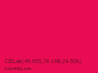 CIELab 49.935,76.168,24.506 Color is a normal rose color and the nearest color is Razzmatazz Crayola #e30b5c. Hex code #ea0c52 and RGB value is rgb(234,12,82). In RGB color space, this color is composed of 92% red, 5% green, 32% blue, In CMYK color space, this color is composed of 0% cyan, 95% magenta, 65% yellow , 8% black , In HSL color space, this color has a hue angle of 341° , 90% saturation and 48% lightness.