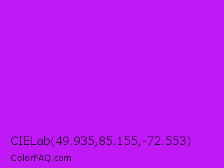CIELab 49.935,85.155,-72.553 Color is a normal purple color and the nearest color is Vivid Mulberry #b80ce3. Hex code #bf19f5 and RGB value is rgb(191,25,245). In RGB color space, this color is composed of 75% red, 10% green, 96% blue, In CMYK color space, this color is composed of 22% cyan, 90% magenta, 0% yellow , 4% black , In HSL color space, this color has a hue angle of 285° , 92% saturation and 53% lightness.