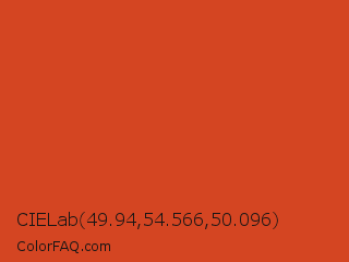 CIELab 49.94,54.566,50.096 Color is a normal red color and the nearest color is Vermilion #d9381e. Hex code #d44522 and RGB value is rgb(212,69,34). In RGB color space, this color is composed of 83% red, 27% green, 13% blue, In CMYK color space, this color is composed of 0% cyan, 67% magenta, 84% yellow , 17% black , In HSL color space, this color has a hue angle of 12° , 72% saturation and 48% lightness.