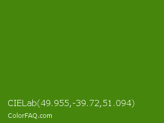 CIELab 49.955,-39.72,51.094 Color is a dark green color and the nearest color is La Palma #368716. Hex code #46860d and RGB value is rgb(70,134,13). In RGB color space, this color is composed of 27% red, 53% green, 5% blue, In CMYK color space, this color is composed of 48% cyan, 0% magenta, 90% yellow , 47% black , In HSL color space, this color has a hue angle of 92° , 82% saturation and 29% lightness.