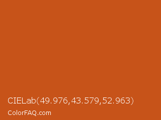 CIELab 49.976,43.579,52.963 Color is a normal orange color and the nearest color is Orange Roughy #c45719. Hex code #c75319 and RGB value is rgb(199,83,25). In RGB color space, this color is composed of 78% red, 33% green, 10% blue, In CMYK color space, this color is composed of 0% cyan, 58% magenta, 87% yellow , 22% black , In HSL color space, this color has a hue angle of 20° , 78% saturation and 44% lightness.