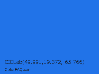 CIELab 49.991,19.372,-65.766 Color is a normal blue color and the nearest color is Blue Crayola #1f75fe. Hex code #2173e8 and RGB value is rgb(33,115,232). In RGB color space, this color is composed of 13% red, 45% green, 91% blue, In CMYK color space, this color is composed of 86% cyan, 50% magenta, 0% yellow , 9% black , In HSL color space, this color has a hue angle of 215° , 81% saturation and 52% lightness.