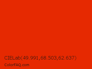 CIELab 49.991,68.503,62.637 Color is a normal red color and the nearest color is Ferrari Red #ff2800. Hex code #e62901 and RGB value is rgb(230,41,1). In RGB color space, this color is composed of 90% red, 16% green, 0% blue, In CMYK color space, this color is composed of 0% cyan, 82% magenta, 100% yellow , 10% black , In HSL color space, this color has a hue angle of 10° , 99% saturation and 45% lightness.