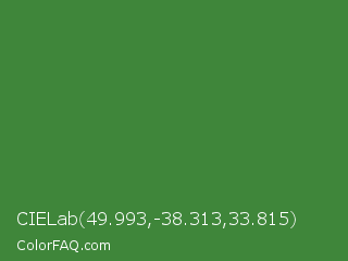 CIELab 49.993,-38.313,33.815 Color is a normal green color and the nearest color is May Green #4c9141. Hex code #3f863a and RGB value is rgb(63,134,58). In RGB color space, this color is composed of 25% red, 53% green, 23% blue, In CMYK color space, this color is composed of 53% cyan, 0% magenta, 57% yellow , 47% black , In HSL color space, this color has a hue angle of 116° , 40% saturation and 38% lightness.