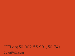 CIELab 50.002,55.991,50.74 Color is a normal red color and the nearest color is Vermilion #d9381e. Hex code #d64321 and RGB value is rgb(214,67,33). In RGB color space, this color is composed of 84% red, 26% green, 13% blue, In CMYK color space, this color is composed of 0% cyan, 69% magenta, 85% yellow , 16% black , In HSL color space, this color has a hue angle of 11° , 73% saturation and 48% lightness.