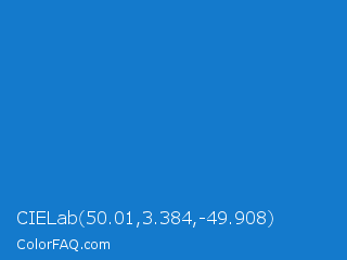 CIELab 50.01,3.384,-49.908 Color is a normal blue color and the nearest color is Bright Navy Blue #1974d2. Hex code #147acc and RGB value is rgb(20,122,204). In RGB color space, this color is composed of 8% red, 48% green, 80% blue, In CMYK color space, this color is composed of 90% cyan, 40% magenta, 0% yellow , 20% black , In HSL color space, this color has a hue angle of 207° , 82% saturation and 44% lightness.