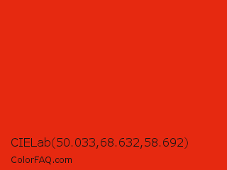 CIELab 50.033,68.632,58.692 Color is a normal red color and the nearest color is Lust #e62020. Hex code #e62910 and RGB value is rgb(230,41,16). In RGB color space, this color is composed of 90% red, 16% green, 6% blue, In CMYK color space, this color is composed of 0% cyan, 82% magenta, 93% yellow , 10% black , In HSL color space, this color has a hue angle of 7° , 87% saturation and 48% lightness.