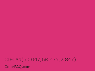 CIELab 50.047,68.435,2.847 Color is a normal rose color and the nearest color is Telemagenta #cf3476. Hex code #db3075 and RGB value is rgb(219,48,117). In RGB color space, this color is composed of 86% red, 19% green, 46% blue, In CMYK color space, this color is composed of 0% cyan, 78% magenta, 47% yellow , 14% black , In HSL color space, this color has a hue angle of 336° , 70% saturation and 52% lightness.