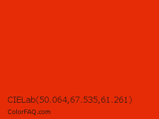 CIELab 50.064,67.535,61.261 Color is a normal red color and the nearest color is Ferrari Red #ff2800. Hex code #e52c06 and RGB value is rgb(229,44,6). In RGB color space, this color is composed of 90% red, 17% green, 2% blue, In CMYK color space, this color is composed of 0% cyan, 81% magenta, 97% yellow , 10% black , In HSL color space, this color has a hue angle of 10° , 95% saturation and 46% lightness.