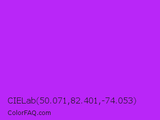 CIELab 50.071,82.401,-74.053 Color is a normal purple color and the nearest color is Veronica #a020f0. Hex code #b926f8 and RGB value is rgb(185,38,248). In RGB color space, this color is composed of 73% red, 15% green, 97% blue, In CMYK color space, this color is composed of 25% cyan, 85% magenta, 0% yellow , 3% black , In HSL color space, this color has a hue angle of 282° , 94% saturation and 56% lightness.