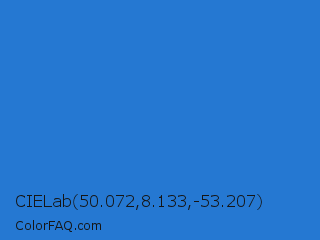 CIELab 50.072,8.133,-53.207 Color is a normal blue color and the nearest color is Bright Navy Blue #1974d2. Hex code #2578d2 and RGB value is rgb(37,120,210). In RGB color space, this color is composed of 15% red, 47% green, 82% blue, In CMYK color space, this color is composed of 82% cyan, 43% magenta, 0% yellow , 18% black , In HSL color space, this color has a hue angle of 211° , 70% saturation and 48% lightness.