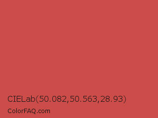 CIELab 50.082,50.563,28.93 Color is a normal red color and the nearest color is English Vermillion #cc474b. Hex code #cc4c49 and RGB value is rgb(204,76,73). In RGB color space, this color is composed of 80% red, 30% green, 29% blue, In CMYK color space, this color is composed of 0% cyan, 63% magenta, 64% yellow , 20% black , In HSL color space, this color has a hue angle of 1° , 56% saturation and 54% lightness.