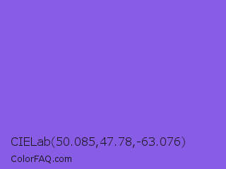 CIELab 50.085,47.78,-63.076 Color is a light indigo color and the nearest color is Navy Purple #9457eb. Hex code #885ce4 and RGB value is rgb(136,92,228). In RGB color space, this color is composed of 53% red, 36% green, 89% blue, In CMYK color space, this color is composed of 40% cyan, 60% magenta, 0% yellow , 11% black , In HSL color space, this color has a hue angle of 259° , 72% saturation and 63% lightness.