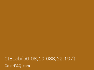CIELab 50.08,19.088,52.197 Color is a normal orange color and the nearest color is Reno Sand #a86515. Hex code #a86916 and RGB value is rgb(168,105,22). In RGB color space, this color is composed of 66% red, 41% green, 9% blue, In CMYK color space, this color is composed of 0% cyan, 38% magenta, 87% yellow , 34% black , In HSL color space, this color has a hue angle of 34° , 77% saturation and 37% lightness.
