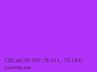 CIELab 50.097,78.011,-75.184 Color is a normal purple color and the nearest color is Veronica #a020f0. Hex code #b033fa and RGB value is rgb(176,51,250). In RGB color space, this color is composed of 69% red, 20% green, 98% blue, In CMYK color space, this color is composed of 30% cyan, 80% magenta, 0% yellow , 2% black , In HSL color space, this color has a hue angle of 278° , 95% saturation and 59% lightness.
