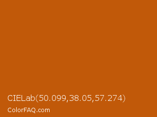CIELab 50.099,38.05,57.274 Color is a normal orange color and the nearest color is Rose Of Sharon #bf5500. Hex code #c15909 and RGB value is rgb(193,89,9). In RGB color space, this color is composed of 76% red, 35% green, 4% blue, In CMYK color space, this color is composed of 0% cyan, 54% magenta, 95% yellow , 24% black , In HSL color space, this color has a hue angle of 26° , 91% saturation and 40% lightness.