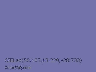 CIELab 50.105,13.229,-28.733 Color is a normal indigo color and the nearest color is Kimberly #736c9f. Hex code #7372a8 and RGB value is rgb(115,114,168). In RGB color space, this color is composed of 45% red, 45% green, 66% blue, In CMYK color space, this color is composed of 32% cyan, 32% magenta, 0% yellow , 34% black , In HSL color space, this color has a hue angle of 241° , 24% saturation and 55% lightness.