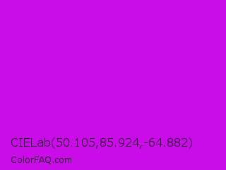 CIELab 50.105,85.924,-64.882 Color is a normal magenta color and the nearest color is Vivid Mulberry #b80ce3. Hex code #c90ce8 and RGB value is rgb(201,12,232). In RGB color space, this color is composed of 79% red, 5% green, 91% blue, In CMYK color space, this color is composed of 13% cyan, 95% magenta, 0% yellow , 9% black , In HSL color space, this color has a hue angle of 292° , 90% saturation and 48% lightness.