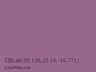 CIELab 50.106,25.16,-10.771 Color is a normal magenta color and the nearest color is Strikemaster #956387. Hex code #99688a and RGB value is rgb(153,104,138). In RGB color space, this color is composed of 60% red, 41% green, 54% blue, In CMYK color space, this color is composed of 0% cyan, 32% magenta, 10% yellow , 40% black , In HSL color space, this color has a hue angle of 318° , 19% saturation and 50% lightness.
