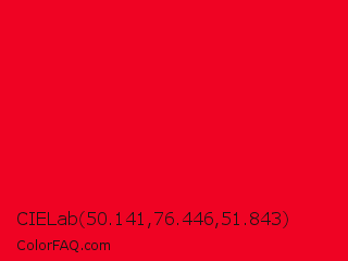 CIELab 50.141,76.446,51.843 Color is a normal red color and the nearest color is Spanish Red #e60026. Hex code #ef0323 and RGB value is rgb(239,3,35). In RGB color space, this color is composed of 94% red, 1% green, 14% blue, In CMYK color space, this color is composed of 0% cyan, 99% magenta, 85% yellow , 6% black , In HSL color space, this color has a hue angle of 352° , 98% saturation and 47% lightness.