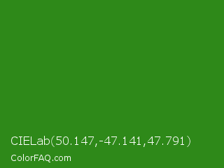 CIELab 50.147,-47.141,47.791 Color is a normal green color and the nearest color is La Palma #368716. Hex code #2e8919 and RGB value is rgb(46,137,25). In RGB color space, this color is composed of 18% red, 54% green, 10% blue, In CMYK color space, this color is composed of 66% cyan, 0% magenta, 82% yellow , 46% black , In HSL color space, this color has a hue angle of 109° , 69% saturation and 32% lightness.
