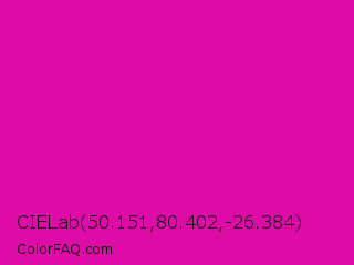 CIELab 50.151,80.402,-26.384 Color is a normal magenta color and the nearest color is Hollywood Cerise #f400a1. Hex code #de0ca6 and RGB value is rgb(222,12,166). In RGB color space, this color is composed of 87% red, 5% green, 65% blue, In CMYK color space, this color is composed of 0% cyan, 95% magenta, 25% yellow , 13% black , In HSL color space, this color has a hue angle of 316° , 90% saturation and 46% lightness.
