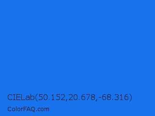 CIELab 50.152,20.678,-68.316 Color is a normal blue color and the nearest color is Blue Crayola #1f75fe. Hex code #1673ed and RGB value is rgb(22,115,237). In RGB color space, this color is composed of 9% red, 45% green, 93% blue, In CMYK color space, this color is composed of 91% cyan, 51% magenta, 0% yellow , 7% black , In HSL color space, this color has a hue angle of 214° , 86% saturation and 51% lightness.