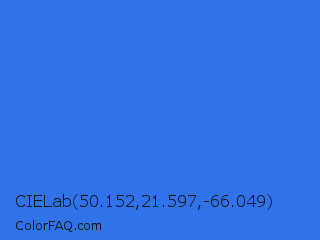 CIELab 50.152,21.597,-66.049 Color is a normal blue color and the nearest color is Royal Blue #4169e1. Hex code #3072e9 and RGB value is rgb(48,114,233). In RGB color space, this color is composed of 19% red, 45% green, 91% blue, In CMYK color space, this color is composed of 79% cyan, 51% magenta, 0% yellow , 9% black , In HSL color space, this color has a hue angle of 219° , 81% saturation and 55% lightness.
