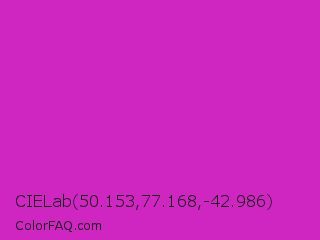 CIELab 50.153,77.168,-42.986 Color is a normal magenta color and the nearest color is Steel Pink #cc33cc. Hex code #cf26c2 and RGB value is rgb(207,38,194). In RGB color space, this color is composed of 81% red, 15% green, 76% blue, In CMYK color space, this color is composed of 0% cyan, 82% magenta, 6% yellow , 19% black , In HSL color space, this color has a hue angle of 305° , 69% saturation and 48% lightness.