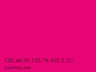CIELab 50.155,78.425,3.32 Color is a normal rose color and the nearest color is Red Purple #e40078. Hex code #e80575 and RGB value is rgb(232,5,117). In RGB color space, this color is composed of 91% red, 2% green, 46% blue, In CMYK color space, this color is composed of 0% cyan, 98% magenta, 50% yellow , 9% black , In HSL color space, this color has a hue angle of 330° , 96% saturation and 46% lightness.