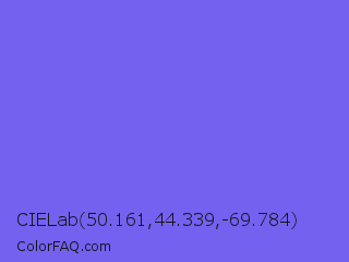 CIELab 50.161,44.339,-69.784 Color is a light indigo color and the nearest color is Medium Slate Blue #7b68ee. Hex code #7461f0 and RGB value is rgb(116,97,240). In RGB color space, this color is composed of 45% red, 38% green, 94% blue, In CMYK color space, this color is composed of 52% cyan, 60% magenta, 0% yellow , 6% black , In HSL color space, this color has a hue angle of 248° , 83% saturation and 66% lightness.