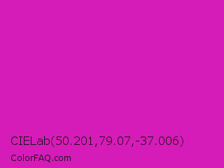 CIELab 50.201,79.07,-37.006 Color is a normal magenta color and the nearest color is Steel Pink #cc33cc. Hex code #d61cb8 and RGB value is rgb(214,28,184). In RGB color space, this color is composed of 84% red, 11% green, 72% blue, In CMYK color space, this color is composed of 0% cyan, 87% magenta, 14% yellow , 16% black , In HSL color space, this color has a hue angle of 310° , 77% saturation and 47% lightness.