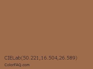 CIELab 50.221,16.504,26.589 Color is a normal orange color and the nearest color is Cape Palliser #a26645. Hex code #9f6c4b and RGB value is rgb(159,108,75). In RGB color space, this color is composed of 62% red, 42% green, 29% blue, In CMYK color space, this color is composed of 0% cyan, 32% magenta, 53% yellow , 38% black , In HSL color space, this color has a hue angle of 24° , 36% saturation and 46% lightness.