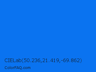 CIELab 50.236,21.419,-69.862 Color is a normal blue color and the nearest color is Brandeis Blue #0070ff. Hex code #0a73f0 and RGB value is rgb(10,115,240). In RGB color space, this color is composed of 4% red, 45% green, 94% blue, In CMYK color space, this color is composed of 96% cyan, 52% magenta, 0% yellow , 6% black , In HSL color space, this color has a hue angle of 213° , 92% saturation and 49% lightness.