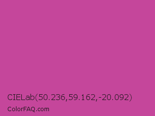 CIELab 50.236,59.162,-20.092 Color is a normal magenta color and the nearest color is Mulberry #c54b8c. Hex code #c5469b and RGB value is rgb(197,70,155). In RGB color space, this color is composed of 77% red, 27% green, 61% blue, In CMYK color space, this color is composed of 0% cyan, 64% magenta, 21% yellow , 23% black , In HSL color space, this color has a hue angle of 320° , 52% saturation and 52% lightness.