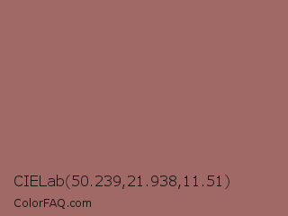 CIELab 50.239,21.938,11.51 Color is a normal red color and the nearest color is Copper Rose #996666. Hex code #a16965 and RGB value is rgb(161,105,101). In RGB color space, this color is composed of 63% red, 41% green, 40% blue, In CMYK color space, this color is composed of 0% cyan, 35% magenta, 37% yellow , 37% black , In HSL color space, this color has a hue angle of 4° , 24% saturation and 51% lightness.