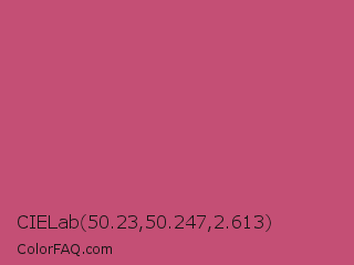 CIELab 50.23,50.247,2.613 Color is a normal rose color and the nearest color is Fuchsia Rose #c74375. Hex code #c44f75 and RGB value is rgb(196,79,117). In RGB color space, this color is composed of 77% red, 31% green, 46% blue, In CMYK color space, this color is composed of 0% cyan, 60% magenta, 40% yellow , 23% black , In HSL color space, this color has a hue angle of 341° , 50% saturation and 54% lightness.