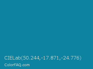 CIELab 50.244,-17.871,-24.776 Color is a normal cyan color and the nearest color is CG Blue #007aa5. Hex code #0d82a1 and RGB value is rgb(13,130,161). In RGB color space, this color is composed of 5% red, 51% green, 63% blue, In CMYK color space, this color is composed of 92% cyan, 19% magenta, 0% yellow , 37% black , In HSL color space, this color has a hue angle of 193° , 85% saturation and 34% lightness.