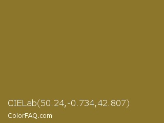 CIELab 50.24,-0.734,42.807 Color is a normal yellow color and the nearest color is Spanish Bistre #807532. Hex code #8b762b and RGB value is rgb(139,118,43). In RGB color space, this color is composed of 55% red, 46% green, 17% blue, In CMYK color space, this color is composed of 0% cyan, 15% magenta, 69% yellow , 45% black , In HSL color space, this color has a hue angle of 47° , 53% saturation and 36% lightness.
