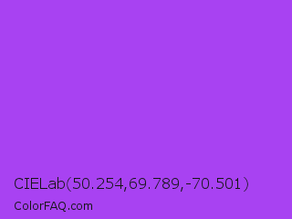 CIELab 50.254,69.789,-70.501 Color is a normal purple color and the nearest color is Navy Purple #9457eb. Hex code #a842f2 and RGB value is rgb(168,66,242). In RGB color space, this color is composed of 66% red, 26% green, 95% blue, In CMYK color space, this color is composed of 31% cyan, 73% magenta, 0% yellow , 5% black , In HSL color space, this color has a hue angle of 275° , 87% saturation and 60% lightness.