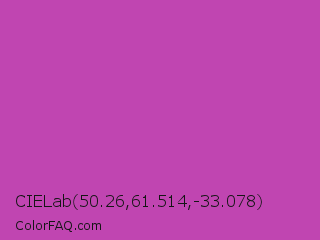CIELab 50.26,61.514,-33.078 Color is a normal magenta color and the nearest color is Fuchsia Pink #c154c1. Hex code #c045b1 and RGB value is rgb(192,69,177). In RGB color space, this color is composed of 75% red, 27% green, 69% blue, In CMYK color space, this color is composed of 0% cyan, 64% magenta, 8% yellow , 25% black , In HSL color space, this color has a hue angle of 307° , 49% saturation and 51% lightness.