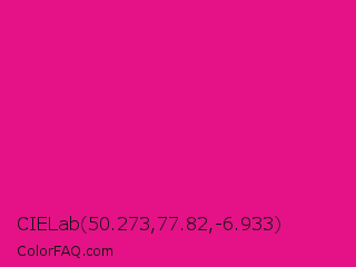CIELab 50.273,77.82,-6.933 Color is a normal magenta color and the nearest color is Vivid Cerise #da1d81. Hex code #e41286 and RGB value is rgb(228,18,134). In RGB color space, this color is composed of 89% red, 7% green, 53% blue, In CMYK color space, this color is composed of 0% cyan, 92% magenta, 41% yellow , 11% black , In HSL color space, this color has a hue angle of 327° , 85% saturation and 48% lightness.