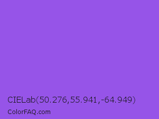 CIELab 50.276,55.941,-64.949 Color is a light violet color and the nearest color is Navy Purple #9457eb. Hex code #9654e8 and RGB value is rgb(150,84,232). In RGB color space, this color is composed of 59% red, 33% green, 91% blue, In CMYK color space, this color is composed of 35% cyan, 64% magenta, 0% yellow , 9% black , In HSL color space, this color has a hue angle of 267° , 76% saturation and 62% lightness.