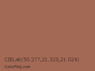 CIELab 50.277,21.323,21.024 Color is a normal color and the nearest color is Santa Fe #b16d52. Hex code #a46955 and RGB value is rgb(164,105,85). In RGB color space, this color is composed of 64% red, 41% green, 33% blue, In CMYK color space, this color is composed of 0% cyan, 36% magenta, 48% yellow , 36% black , In HSL color space, this color has a hue angle of 15° , 32% saturation and 49% lightness.