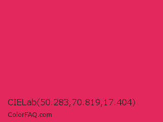 CIELab 50.283,70.819,17.404 Color is a normal rose color and the nearest color is Cerise Red #de3163. Hex code #e3285e and RGB value is rgb(227,40,94). In RGB color space, this color is composed of 89% red, 16% green, 37% blue, In CMYK color space, this color is composed of 0% cyan, 82% magenta, 59% yellow , 11% black , In HSL color space, this color has a hue angle of 343° , 77% saturation and 52% lightness.