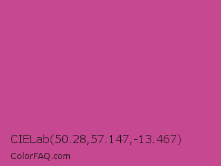 CIELab 50.28,57.147,-13.467 Color is a normal magenta color and the nearest color is Mulberry #c54b8c. Hex code #c64890 and RGB value is rgb(198,72,144). In RGB color space, this color is composed of 78% red, 28% green, 56% blue, In CMYK color space, this color is composed of 0% cyan, 64% magenta, 27% yellow , 22% black , In HSL color space, this color has a hue angle of 326° , 53% saturation and 53% lightness.