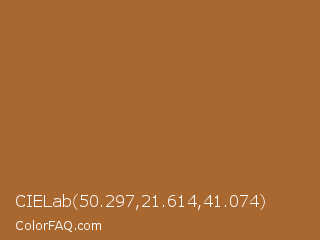 CIELab 50.297,21.614,41.074 Color is a normal orange color and the nearest color is Liver Dogs #b86d29. Hex code #aa6831 and RGB value is rgb(170,104,49). In RGB color space, this color is composed of 67% red, 41% green, 19% blue, In CMYK color space, this color is composed of 0% cyan, 39% magenta, 71% yellow , 33% black , In HSL color space, this color has a hue angle of 27° , 55% saturation and 43% lightness.