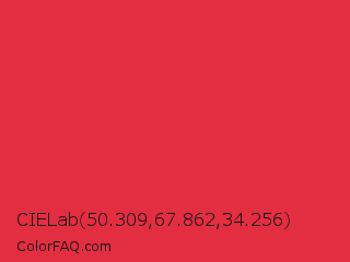 CIELab 50.309,67.862,34.256 Color is a normal red color and the nearest color is Rusty Red #da2c43. Hex code #e32e42 and RGB value is rgb(227,46,66). In RGB color space, this color is composed of 89% red, 18% green, 26% blue, In CMYK color space, this color is composed of 0% cyan, 80% magenta, 71% yellow , 11% black , In HSL color space, this color has a hue angle of 353° , 76% saturation and 54% lightness.