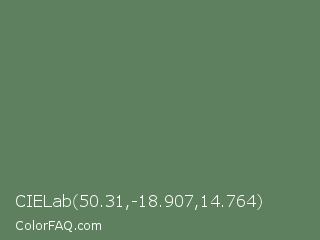 CIELab 50.31,-18.907,14.764 Color is a normal green color and the nearest color is Glade Green #61845f. Hex code #5f805e and RGB value is rgb(95,128,94). In RGB color space, this color is composed of 37% red, 50% green, 37% blue, In CMYK color space, this color is composed of 26% cyan, 0% magenta, 27% yellow , 50% black , In HSL color space, this color has a hue angle of 118° , 15% saturation and 44% lightness.
